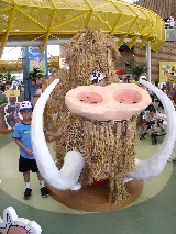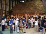 無茶苦茶暑い日になりました。会場も相変わらず混んでいるので、今日はマイナーな「遊びと参加ゾーン」にでかけました。とにかく暑いので、まずは「水の広場」で水遊び。たくさんの子どもたちが水遊びに興じていました。次は、Yu-pinが「くるくる!」と大喜びしていた大観覧車に乗ろうということで、ファミリー愛ランドへ。1つ1つのゴンドラに装備されたルーフエアコン(これはキャンピングカーに定番でつけられるタイプのものでした)が快適でしたが、「自然環境について考える万博に、大量にエネルギーを消費するエアコン・・・?」という疑問も。そういえば各パビリオン・休憩施設とも空調はガンガン効いていました。トルコ風アイス「どんどるまん」のパフォーマンスを楽しみながら食べ、モリゾー・キッコロの像で記念撮影をしてから「わんパク宝島」へ。ここは食に関するパビリオンで、“食育”をはじめ人間ゴンのキャラクターたちと楽しく学べました。次にグローバルコモン5に足を運び、アフリカ共同館などを見て回りました。